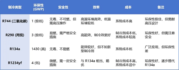 常用汽車制冷劑R134a因高達(dá)1400GWP不滿足環(huán)保法規(guī)需求正加速淘汰,零ODP、低GWP(≤4)的R744、R290和R1234yf 等新型環(huán)保冷媒成為汽車?yán)涿教娲x擇。綜合對(duì)比來看,R290因更高的氣化潛熱、更小的分子質(zhì)量、更高的工作壓力及工作密度,能大大減少車輛熱泵空調(diào)系統(tǒng)中制冷劑的充注量,在能效、環(huán)保性和經(jīng)濟(jì)性上均優(yōu)于R744、R1234yf和R134a,因此R290有望成為全球汽車?yán)涿教娲闹髁鬟x擇。
