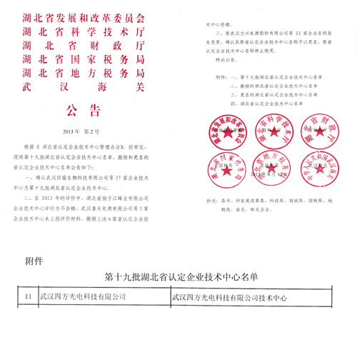 2013年8月12日,我公司技術(shù)中心被湖北省發(fā)展和改革委員會、湖北省科學(xué)技術(shù)廳、湖北省財政廳、湖北省國家稅務(wù)局、湖北省地方稅務(wù)局、武漢海關(guān)聯(lián)合認(rèn)定為“省級企業(yè)技術(shù)中心”,預(yù)示著我公司科技創(chuàng)新工作揭開了新篇章。