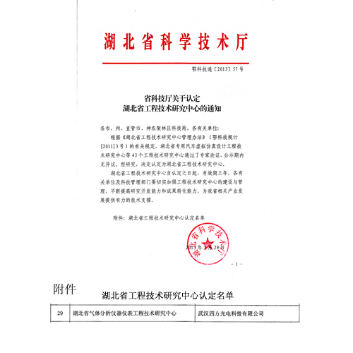 2013年7月29日,依托我公司技術(shù)中心建立的湖北省氣體分析儀器儀表工程技術(shù)研究中心通過(guò)專家論證,被湖北省科學(xué)技術(shù)廳認(rèn)定為湖北省工程技術(shù)研究中心。