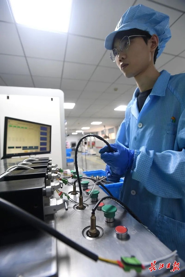 四方光電生產(chǎn)車(chē)間,研發(fā)生產(chǎn)人員正進(jìn)行高溫氧氣傳感器測(cè)試。長(zhǎng)江日?qǐng)?bào)記者周超 攝