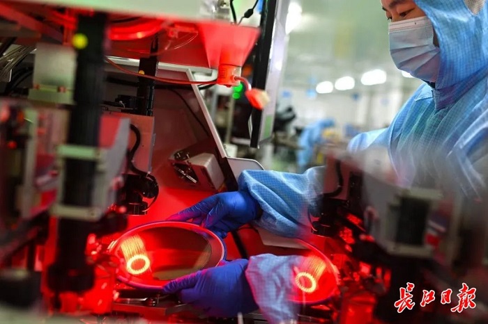 四方光電芯片車(chē)間,研發(fā)生產(chǎn)人員正進(jìn)行激光器芯片的固晶程序。長(zhǎng)江日?qǐng)?bào)記者周超 攝