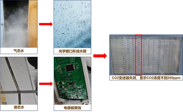 為保持適宜的濕度,菇農(nóng)們使用手持噴霧器或微噴系統(tǒng),向菇房內(nèi)均勻噴灑細小的水霧,伴隨著菌群呼吸產(chǎn)生的水汽,菌菇房儼然成為了天然的“蒸汽房”。此時,水分子則通過兩種形態(tài)向CO?變送器發(fā)起攻擊!